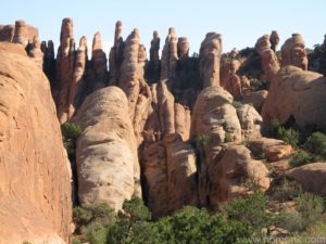 We headed back into Arches National Park for a second day. After a brief stop on the drive in at Fiery Furnace, we headed to Landscape Arch, or rather, the trail head near it. Prior to Landscape arch, we stopped at Pine Tree Arch, which as you may guess, is an arch with a pine tree growing in it. Landscape Arch is naturally an arch that lends itself well to being shown in landscape format (as opposed to portrait). It’s also, I think, the most recent site of a collapse and the only one caught on picture. Landscape Arch is open for distance viewing only from a defined path, maybe because of the recent collapse, maybe because it’s just kind of rough terrain to get to it.